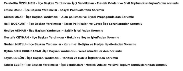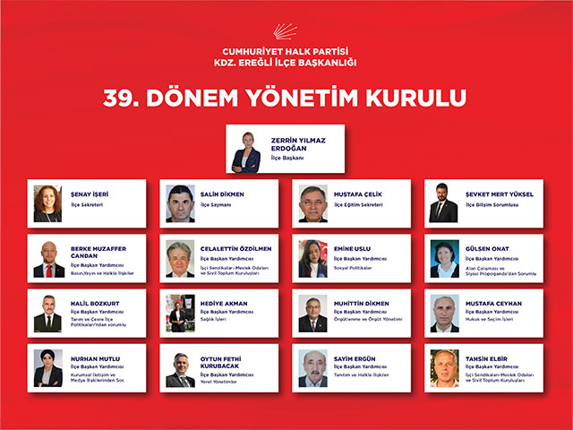 GÖREVLER BELİRLENDİ![]() Zonguldak’ın Karadeniz Ereğli İlçesinde, Cumhuriyet Halk Partisi’nin (CHP) 39. İlçe Kongresinde, Zerrin Yılmaz Erdoğan Başkanlığında seçilen yönetim kurulunun görev bölümü yaptığı bildirildi. CHP İlçe Başkanlığından yapılan yazılı açıklamada, Erdoğan başkanlığında ilk toplantısını gerçekleştiren yönetimde Şenay İşeri İlçe Sekreteri, Şevket Mert yüksel İlçe Bilişim Sorumlusu, Salih Dikmen İlçe Saymanı, Mustafa Çelik de İlçe Eğitim Sekreteri görevlerine seçildiler. Berke Muzaffer Candan’ın Basın Yayın ve Halkla İlişkilerden sorumlu Başkan yardımcısı, Muhittin Dikmen’in de Örgütlenme ve Örgüt Yönetiminden Sorumlu Başkan Yardımcısı seçildiği yönetimde, diğer görevler ise şöyle oluştu: