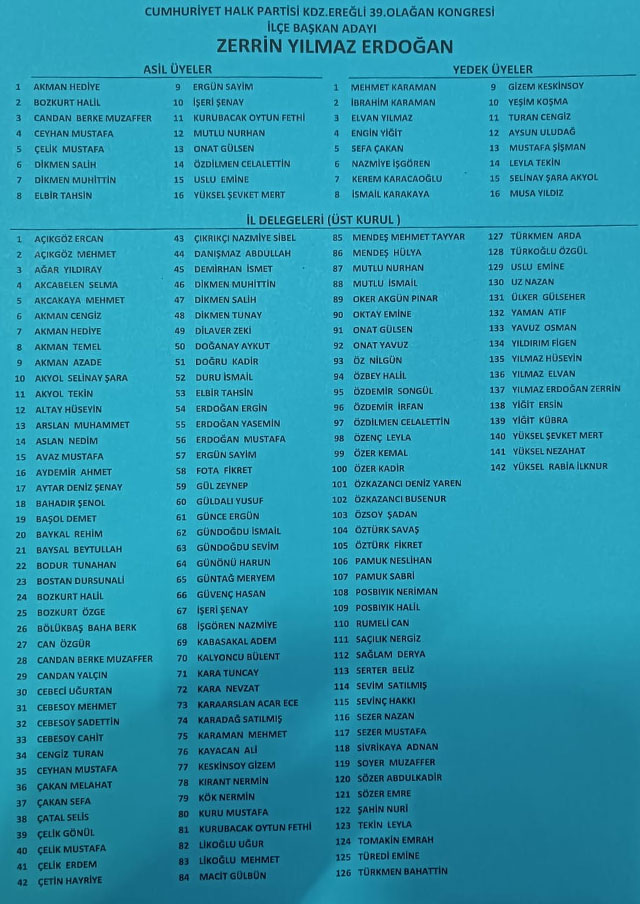 CHP’YE YENİ BAŞKAN; ERDOĞAN![]() Zonguldak’ın Karadeniz Ereğli İlçesindeki Cumhuriyet Halk Partisi İlçe Kongresindeki seçimlerde Zerrin Yılmaz Erdoğan delegenin çoğunluğunun oyunu alarak başkanlığa seçildi. Sandıkların açılması ve oyların sayılması sonrası kesin olmayan sonuçlara göre, 393 delegenin geçerli sayıldığı oylardan 172 oy alan Erdoğan CHP Karadeniz Ereğli İlçe Başkanlığına seçildi. Mevcut Başkan Ali Kocamanoğlu ise 125 oyda kaldı. Güven Demir’e 52 delegenin oy verdiği seçimlerde Noyan Keskin 25 Asım Bozkurt ise 19 oyda kaldı. KIRSALDA GÜNDOĞDU FARKI Bu arada, Erdoğan'ın listesini desteklediği bilinen CHP İl Genel Meclis Üyesi Kenan Gündoğdu'nun, ağırlıklı olarak çalıştığı köylerden Erdoğan'a önemli oy geldiği gözlendi. CHP İLÇE BAŞKANI ZERRİN YILMAZ ERDOĞAN'IN LİSTESİ