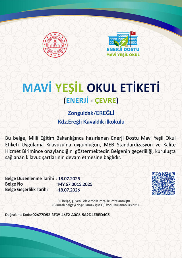 KAVAKLIK’TA YEŞİL VE MAAVİ OLDU!![]() Zonguldak’ın Karadeniz Ereğli İlçesindeki Kavaklık İlkokulu’nun da “Mavi Yeşil Okul Etiketi” sahibi olduğu bildirildi. Okulun sosyal hesaplarındaki paylaşımlarında, Milli Eğitim Bakanlığınca (MEB), ağaç dikimi gibi yeşile yönelik çalışmalarda bulunan okullara başlattığı uygulamada gerekli kriterlerin yerine getirildiği belirtildi. Okul idaresinin aldığı kararlarla, başta enerji kullanımı olmak üzere çevre düzenlemeleri de yapılan okulun; MEB’in olurunu aldığı anlatılan açıklamada, “yapılan denetimler sonucu okulumuz Bakanlığımızdan 18 Temmuz 2025 tarihli gönderilen belge ile ‘Mavi Yeşil Okul Etiketi’ne sahil oldu. Emeği geçenlere teşekkür ediyoruz” denildi. 18 Temmuz 2026’ya kadar geçerli belgenin sürekli hale kalabilmesi için MEB’in belirlediği kriterleri ileriki süreçlerde de yerine getirilmesi gerekiyor.