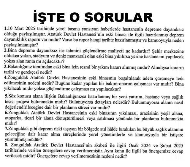 ENDİŞESİNİ DİLE GETİRDİ![]() Cumhuriyet Halk Partisi (CHP) Zonguldak Milletvekili Op. Dr. Eylem Ertuğ Ertuğrul, Zonguldak’taki eski Atatürk Devlet Hastanesi binası ile ilgili belirsizliğin devam ettiğini bildirdi. Ertuğrul, Sağlık Bakanı Prof. Dr. Kemal Memişoğlu’nun yanıtlaması ile ilgili Türkiye Büyük Millet Meclisi’ne verdiği soru önergesinde, söz konusu hastane binasının adeta ‘çürümeye bırakıldığını’ iddia etti. Binanın yaklaşık 3 yıldır boş bulunduğuna dikkat çeken CHP Zonguldak Milletvekili Ertuğrul, soru önergesine ilişkin şunları kaydetti: “Söz konusu bina hakkında kamuoyuna net bir açıklama yapılmaması, depreme dayanıksızlık raporlarının paylaşılmaması ve alanın akıbetine ilişkin belirsizlik ciddi bir endişe kaynağı haline gelmiştir. Yerel basında yer alan haberlerde, yıkım kararı verilmesine rağmen yeni yapılacak proje ya da alanın nasıl değerlendirileceğine ilişkin herhangi bir bilgi paylaşılmadığı belirtilmektedir.Öte yandan,yenihastanebinasındayoğunbakımyataksayısınınazaltıldığıveotoparkkapasitesinin yetersiz olduğu iddiaları da vatandaşlar açısından önemli bir sorunoluşturmaktadır.”