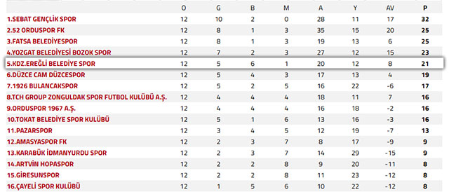 Geçtiğimiz Cumartesi iç sahada (Şehit Vefa Karakurdu/Beyçayırı) oynadıkları karşılaşmayı 2-0 galibiyet ve kayıpsız puan ile geçtiklerini hatırlatan Başkan yılmaz, şunları kaydetti: “Birçok kulüp gibi geçtiğimiz zorlu süreçte, yönetim ve teknik kadromuzun çalışmaları sonucu yapılan transferlerin isabetli oluşları takımın ortaya koyduğu futbola yansıdı. Öncelikle Amasyaspor maçındaki galibiyet dolayısıyla teknik heyetimizi ve futbolcularımızı kutluyoruz. Elbette, takımımızı sahada yalnız bırakmayan ‘12. Adam’ olan taraftarlarımızın yüksek deştiğini bir kez daha hatırlatmalıyım. Her bir taraftarımıza ve karşılaşmayı izlemeye gelen sporseverlere teşekkür ediyorum. Ancak bu karşılaşma geride kaldı, biz ise ileriye bakmak zorundayız. Bu nedenle, hafta sonu (12 Aralık) deplasmanda oynayacağımız Çayeli Spor karşılaşması çok önemli. Bu karşılaşmayı da galibiyetle tamamlayıp, hanemize 3 puan daha yazdırmak istiyoruz. Takımımızın da bunu başaracak güçte olduğuna inanıyoruz.” DESTEKLER DEVAM ETMELİ Karadeniz Ereğli Belediye Spor Kulübü Başkanı Recep Yılmaz, elde edilen her başarının Karadeniz Ereğli’ye yansıdığını hatırlattığı açıklamasında, “Kent olarak birlikte paylaştığımız ve paylaştığımız bu başarının kalıcı olması için, taraftar desteğimiz kadar ilçemizdeki sanayi kuruluş ve işletmelerin maddi desteğinin de sürmesini bekliyoruz. Bugüne kadar sağlanan desteklerin artacağına olan inancımızı da sürdürüyoruz” diye konuştu. Sebat Gençlik Spor’un 32 puanla liderlik koltuğunda oturduğu cetvelde; 25 puana sahip Ordusyor ikinci, aynı puan ve avarajla Fatsa Belediyespor üçüncü, 23 puana sahip Yozgat Belediyespor da dördüncü sırada yer alıyor. Geçen haftayı deplasmanda yenilgi ile tamamlayan Zonguldakspor ise 16 puanda kalarak cetvelde 8. Sıraya geriledi. 3. LİG. 3. GRUP'TA PUAN CETVELİ