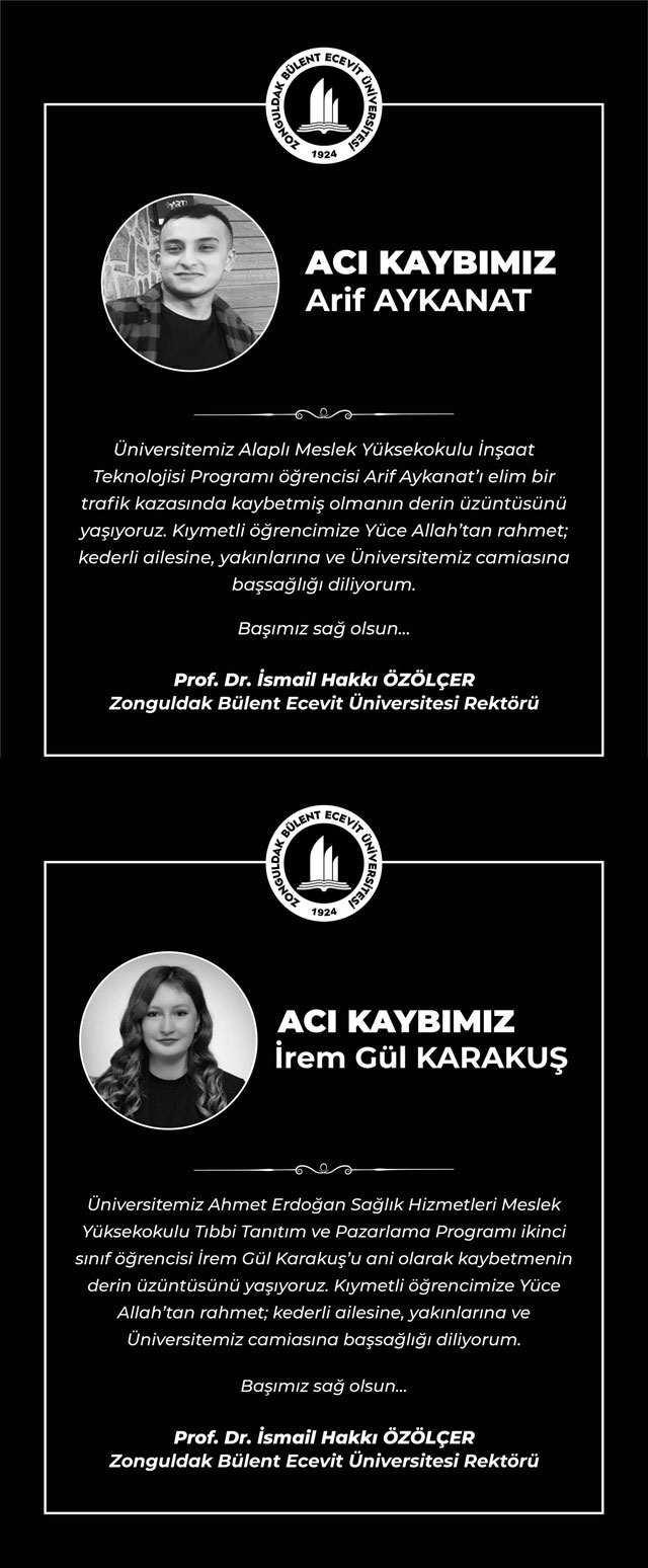 REKTÖR TAZİYELERİNİ BİLDİRDİ![]() Zonguldak Bülent Ecevit Üniversitesi (BEUN) Rektörü Prof. Dr. İsmail Hakkı Özölçer, üniversite bünyasindeki okullarda eğitim gören 2 öğrencinin yaşamlarını yitirmeleri üzerine başsağlığı mesajları yayınladı. Rektör Özölçer, yayınladığı ilk mesajında; aynı zamanda BEUN Alaplı Meslek Yüksek Okulu İnşaat Teknolojisi Programı Öğrencisi 25 yaşındaki Arif Aykanat ,dün (10 Aralık) sabah saatlerinde Zonguldak’ın Ereğli İlçesinde motosikleti ile geçirdiği trafik kazası sonrası yaşamını yitirdiğini hatırlattı. Rektör Özölçer, ikinci paylaşımında ise BEUN Sağlık Hizmetleri Meslek Yüksekokulu Tıbbı Tanıtım ve Pazarlama Programı 2’nci sınıf öğrencisi İrem Gül Karakuş’un, kaybetmenin üzüntüsü yaşadıklarını belirtti. BEUN Röektörü Prof. Dr. İsmail Hakkı Özölçer, ayrı ayrı yayınladığı mesajlarla; öğrencilere Allah’tan Rahmet, kederli ailelerine ise başsağlığı dileğinde bulundu.