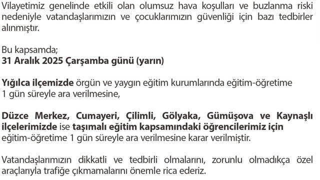 DÜZCE’DE OKULLAR TATİL![]() Düzce Valiliği, yoğun kar yağışı tahmini nedeniyle 31 Mart’ta okulların 1 gün tatil edildiğini duyurdu. Valiliğin sosyal hesaplarından yapılan duyuruda, şunlar kaydedildi: