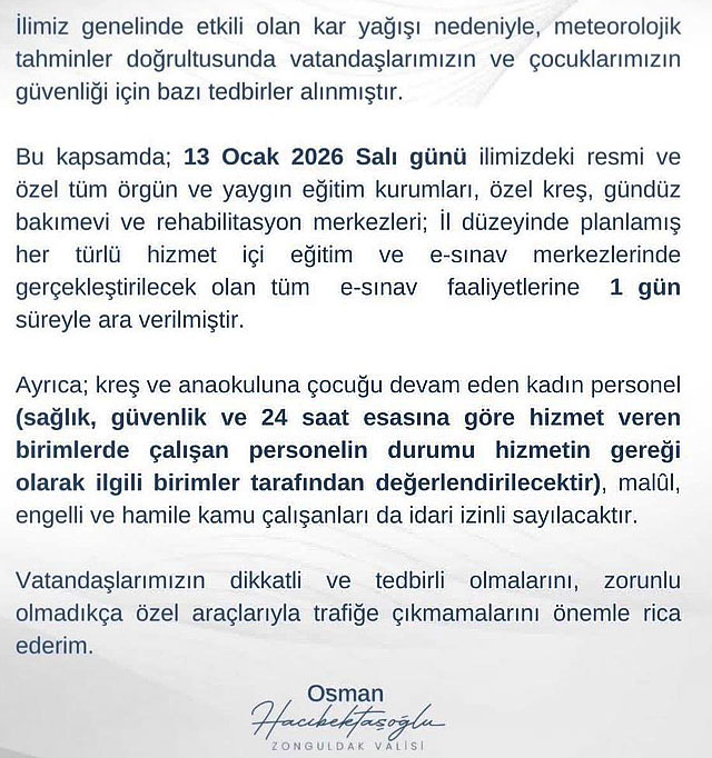 VALİLİK AÇIKLARI; OKULLAR TATİL!![]() Zonguldak ve İlçelerinde okulların bir günlüğüne tatil edildiği bildirildi. Zonguldak Valiliğinin sabaha karşı saatlerdeki yazılı açıklamasına göre, bölgeyi etkisi altına alan kar yağışı nedeniyle ilk, orta, lise ve dengi okular 13 Ocak’ta tatil edildi. Açıklamada şöyle denildi:
