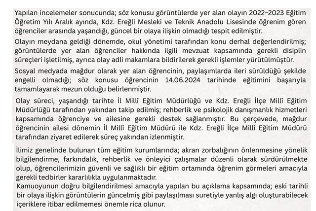 VALİLİK AÇIKLADI!![]() Sosyal medyada yer bulan, ‘engelli öğrenciye akran zorbalığı’na yönelik görüntülerin yeni olmadığı bildirildi. Zonguldak Valiliğinden yapılan yazılı açıklamada, yapılan iceleme sonucunda söz konusu görüntülerin 2022-2023 Eğitim Öğretim yılı Aralık ayında Karadeniz Ereğli Mesleki ve Teknik Anadolu Lisesinde öğrenim gören öğrenciler arasında yaşadığı hatırlatıldı. Görüntülerin güncel bir olaya ilişkin olmadığına dikkat çekilen açıklamada, şunlar kaydedildi: “