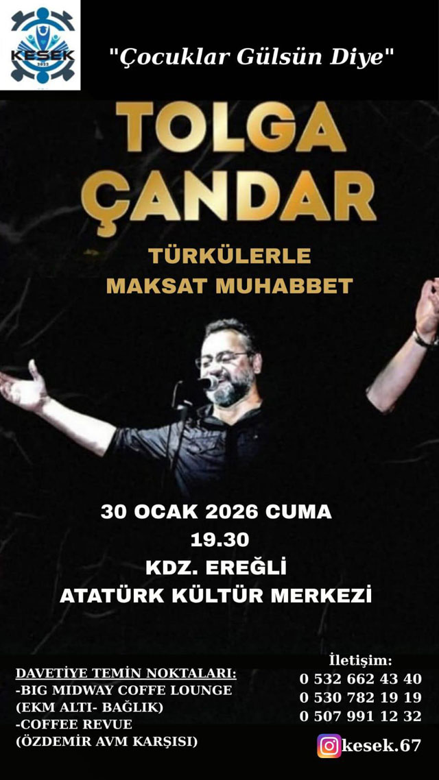 KONSERİN AMACI ÇOK ANLAMLI![]() Tolga Çandar’ın, Zonguldak’ın Karadeniz Ereğli İlçesinde, konser vereceği bildirildi. İlçede kurulu Karadeniz Ereğli Sanat Eğitim Kültür ve Sosyal Yardımlaşma Derneği’nin organizesinde “Çocuklar Gülsen Diye” temalı etkinlik, 30 Ocak’ta Karadeniz Ereğli Atatürk Kültür Merkezinde gerçekleştirilecek. Tolga Çandar’ın “Türkilerle Maksat Muhabbet” sloganı ile vereceği konser saat 13.30’da başlayacak.