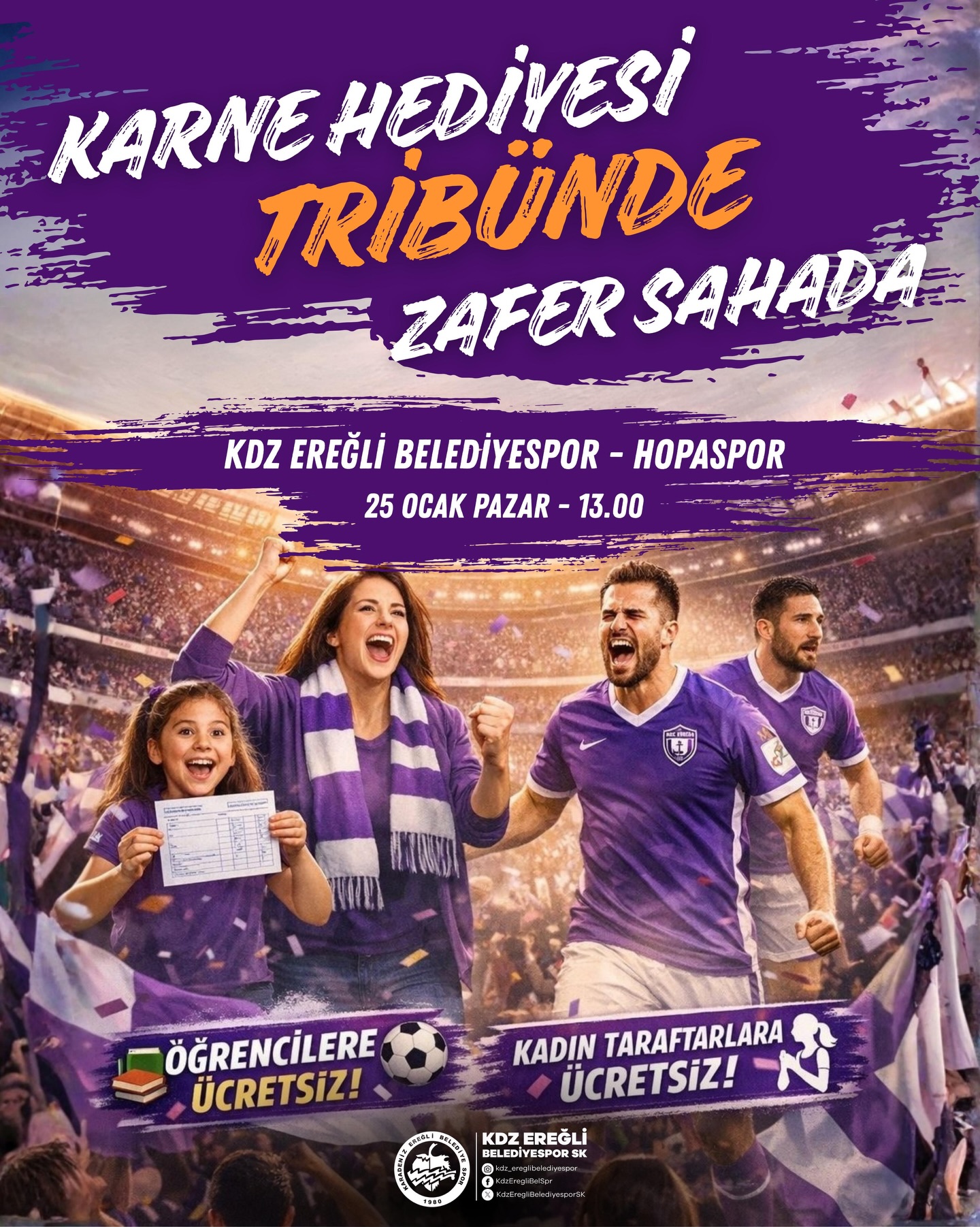 ÖĞRENCİ VE KADINLARA BEDAVA![]() Zonguldak’ın Karadeniz Ereğli İlçesinde yarın (25 Ocak) oynanacak Karadeniz Ereğli Belediye Spor ve Artvin Hopa Spor karşılaşmasının öğrenci ve kadınların ücretsiz izleyebileceği bildirildi. Kulübün sosyal hesaplarında “ Karne Hediyesi Tribünde Zafer Sahada” sloganı ile yapılan duyuruda yarın saat : 13:00 ‘de Şehit Vefa Karakurdu (Beyçayırı) stadındaki karşılaşmaya öğrenciler ve kadın taraftarlar davet edildi.