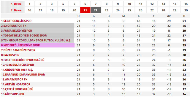 PUAN CETVELİNDE DURUM TFF 3. Ligi 3. Grupta geçilen 21 hafta sonunda Sebat Gençlikspor 51 puanla liderliğini sürdürürken, mevcut tabloda play-off’a kalacak 4 takım ise 2. Sırada 45 puanla 52 Orduspor SK, 3. Sırada 39 puana sahip Fatsa Belediyespor 4. Sırada 37 puanlı Yozgat Belediyesi Bozak Spor ve 5. sırada 35 puanı bulunan TCH Group Zonguldakspor olarak görülüyor. Zonguldakspor’ ile aynı puana (35) sahip Karadeniz Ereğli Belediyespor ise avaraj ile 6 sırada yer alıyor. Bu hafta oynanacak karşılaşmalarda Yozgat’ın yenilmesi, Zonguldaksypor’un yenilmesi yada berabere kalması durumunda, 52 Orduspor SK maçını kazanması halinde Karadeniz Ereğli Belediyespor’un 4. Sıraya yerleşmesini sağlayacak.