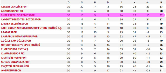AVANTAJ BİZDEEEE…![]() TFF 3. Lig 3. Grup’ta bir üst lige çıkma mücadelesi veren Karadeniz Ereğli Belediyespor, evinde oynadığı karşılaşmayı kazanarak Play-Off karşılaşmasında saha avantajını elde etti. Bugün (18 Nisan) Karadeniz Ereğli İlçesindeki Şehit Vefa Karakurdu (Beyçayırı Stadı’nda Orduspor 1967’yi konuk eden Eflatun-Beyazlılar, maçın 44. Dakikasında Yusuf Sarohan’ın golü ile (1-0) öne geçti. 45+2. Uzatma dakikasında bu kez Bertuğ Bayar ile golü bulan Karadeniz Edeğli Belediyespor, devreye 2-0 önde gitti. İkinci yarıda rakibin atakları ön plana çıkarken golü de 51. Dakikada Koray Dağ ile buldu. (2-1). Ataklarını sürdüren konuk takım Ordu 8. Dakikada bu kez Utku Şen ile golü bularak beraberliği sağladı. (2-2) Kardeniz Ereğli ekibi aynı zamanda Zonguldak’ın plaka numarası 67. Dakikada Mert Efe Çölbeyi ile bir kez daha öne geçerken (3-2), rakipten cevap ise 81. dakikaKoray Dağ’dan geldi. İki tarafından açık futbol sergilediği bol gülle karşılaşmanın ilerleyen dakikalarında ev sahibi takımın atakları fazlalaştı. Arda Yumurtacı ile 86. Dakikada durumu 4-3’e taşıyan Karadeniz Ereğli Belediyespor, 89. Dakikada ise Emin Arda Doğan ile perdeyi kapatan golü buldu. (5-3) PLAY-OFF AVANTAJI EREĞLİ’DE… Play Off-kalmayı önceki haftalarda garantileyen Karadeniz Ereğli Belediyespor, bu galibiyetle ulaştığı 57 puanla ligi 3. Sırada tamamladı. Statü gereği grubundaki 4. Sırada yer alan aynı puana sahip Yozgat Belediyesi Bozokspor ile Play-Off karşılaşması oynayacak olan Ereğli ekibi, ligde iki takım arasındaki karşılaşmalarda (1-2) (1-1) elde ettiği avarajla ilk maçı rakip sahada, ikinci maçı ise evinde olmaya hak kazandı. Play-Off ilk karşılaşması 24 Nisan'da Yozgat'ta, 28 Nisan'da ise Karadeniz Ereğli'de oynanacak. TFF 3 LİG. 3. GRUPTA SEZON SONU PUAN DURUMU