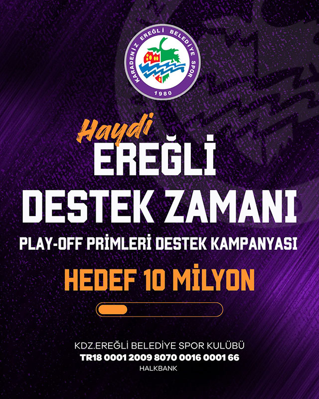 HEDEF 10 MİLYON!..![]() Türkiye Futbol Federasyonu (TFF) 2. Lige yükselme (Play-OFF) karşılaşmaları oynayan Karadeniz Ereğli Belediyespor’da, “Prim Destek Kampanyası” başlatıldığı bildirildi. Kulübün sosyal hesaplarında, “Haydi Zonguldak, Haydi Ereğli, Şimdi Destek Zamanı” mottosu ile yapılan paylaşımlarda, şunlar kaydedildi: “Şimdi takımına sahip çıkma zamanı… Şimdi Ereğli’nin gücünü gösterme zamanı! 23 yıl sonra yeniden yükseldiğimiz bu yolda, play-off heyecanını sonuna kadar yaşıyoruz. Takım olarak 2. Lig hedefimize yürekten inanıyoruz. Bu inancı daha da büyütmek, bu şehri hak ettiği yere taşımak için şimdi kenetlenme vakti! Bu mücadele sadece sahada değil; tribünde, sokakta, şehirde omuz omuza verilerek kazanılacak bir mücadeledir. Ereğli’nin birlik olduğunda neler başarabileceğini herkes biliyor… Şimdi bunu bir kez daha gösterme zamanı! Türkiye’nin dört bir yanında play-off oynayan güçlü şehir takımlarına karşı verdiğimiz bu zorlu yolda, siz kıymetli destekçilerimizin maddi ve manevi katkıları en büyük gücümüz olacaktır. Kampanya sürecimiz boyunca bizlere destek veren tüm kişi ve kuruluşların isimleri ile destek tutarları, kulübümüzün resmi sosyal medya hesaplarından paylaşılacaktır. Gelin, bu hikayeyi birlikte yazalım… Gelin, Ereğli’yi 2. Lig’e birlikte taşıyalım! Karadeniz Ereğli Belediyespor; Göğsümüzde armamız, kalbimizde şehrimiz…” İLK MAÇ BU AKŞAM! Bu arada, mücadele ettiği TFF 3. Lig 3. Grupta topladığı 57 puan ile ligi 3. sırada tamamlayarak Play-Off’a kalan Eflatun-Beyazlılar, ilk karşılaşmasını bu akşam (24 Nisan) oynayacak. Karadeniz Ereğli belediyespor, aynı puana sahip buan cetvelinde 4. Sıradakı Aynı puana sahip dördüncü sıradaki Yozgatspor ile Yozgat’ta oynayacağı karşılaşma saat 20.00’de başlayacak. Bu maçın rövanşı ise 28 Nisan’da Karadeniz Ereğli İlçesindeki Şehit Vefa Karakurdu (Beyçayırı( Stadı’nda saat 15.00’de oynanacak.